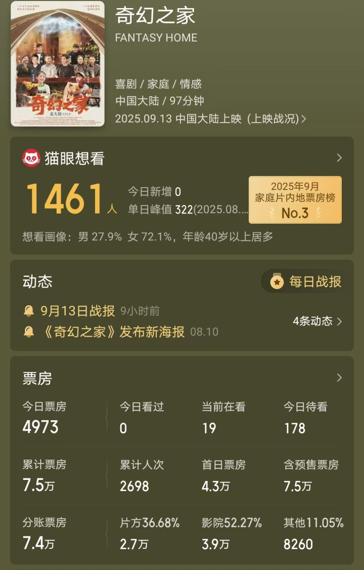 《奇幻之家》是一部家庭奇幻冒险片,该片的主演阵容除了赵文琪外,还有斯琴高娃、天赐、李琦和“雪饼猴”等多位知名演员的加盟。借此,它的票房再低也应该能够达到几百万人民币。但是这部电影还是因为口碑太差,而导致票房都没能达到10万人民币。