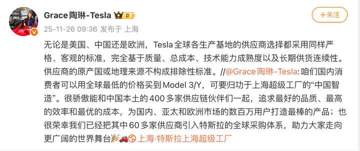 同时陶琳还转发了此前发布的内容。据其透露,特斯拉已和中国本土的 400 多家供应链伙伴们一起,追求最好的品质、最高的效率和最优的成本,为国内、亚太和欧洲市场的数百万用户打造最棒的产品。