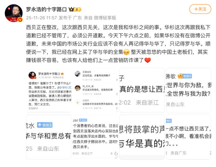 在昨日中午,罗永浩直接发文表示「西贝正在整改,这次跟西贝无关,是我和华杉之间的事。」并要求华杉在昨日下午六点前公开道歉。同时罗永浩还强调: