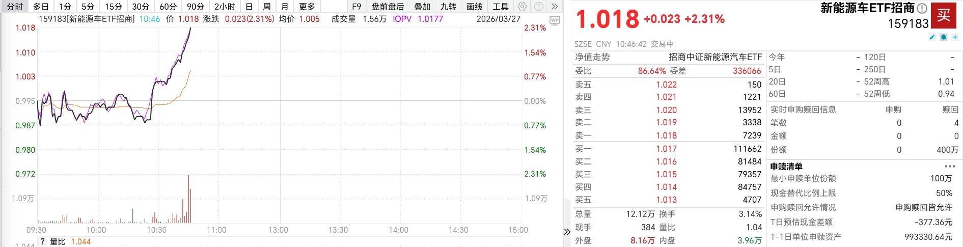 昨日,锂电概念集体走强,锂矿方向表现活跃,新能源车ETF招商(159183)逆势收涨0.61%。3月27日开盘,三大指数低开回升,集体翻红,锂电延续强势,截至发稿,新能源车ETF招商(159183)涨2.31%。成份股方面,盛新锂能涨停,天华新能涨超11%,中矿资源、赣锋锂业等多股领涨,三花智控、贝特瑞、德福科技等股跌幅靠前。